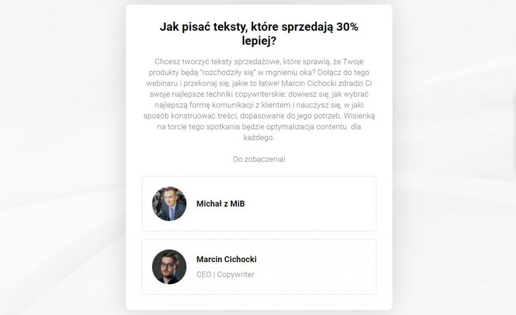 - Webinar „Jak pisać teksty, które sprzedają 30% lepiej?”, który odbędzie się we wtorek (4 maja) o godzinie 19:00. Prelegenci: Michał z NIB i Marcin Cichocki. Organizator: WebinarJam.