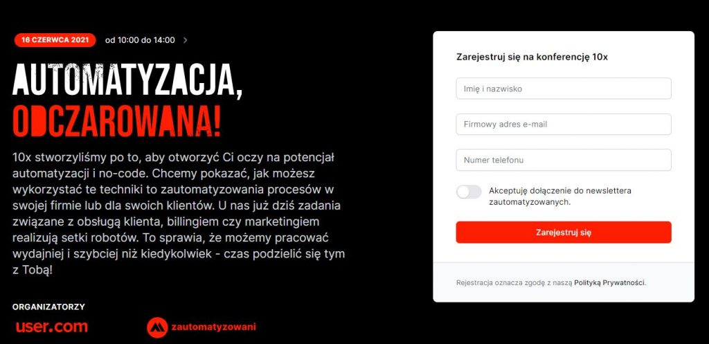 - Wydarzenie „Automatyzacja. Odczarowana!”, które odbędzie się w czwartek (10 czerwca) w godzinach od 10:00 do 14:00. Prelegenci: Adam Gospodarczyk (twórca Overment), Michał Korba (COO & Co-Founder, User.com) i Grzegorz Róg (twórca eduweb.pl). Organizatorzy: User.com, Zautomatyzowani.